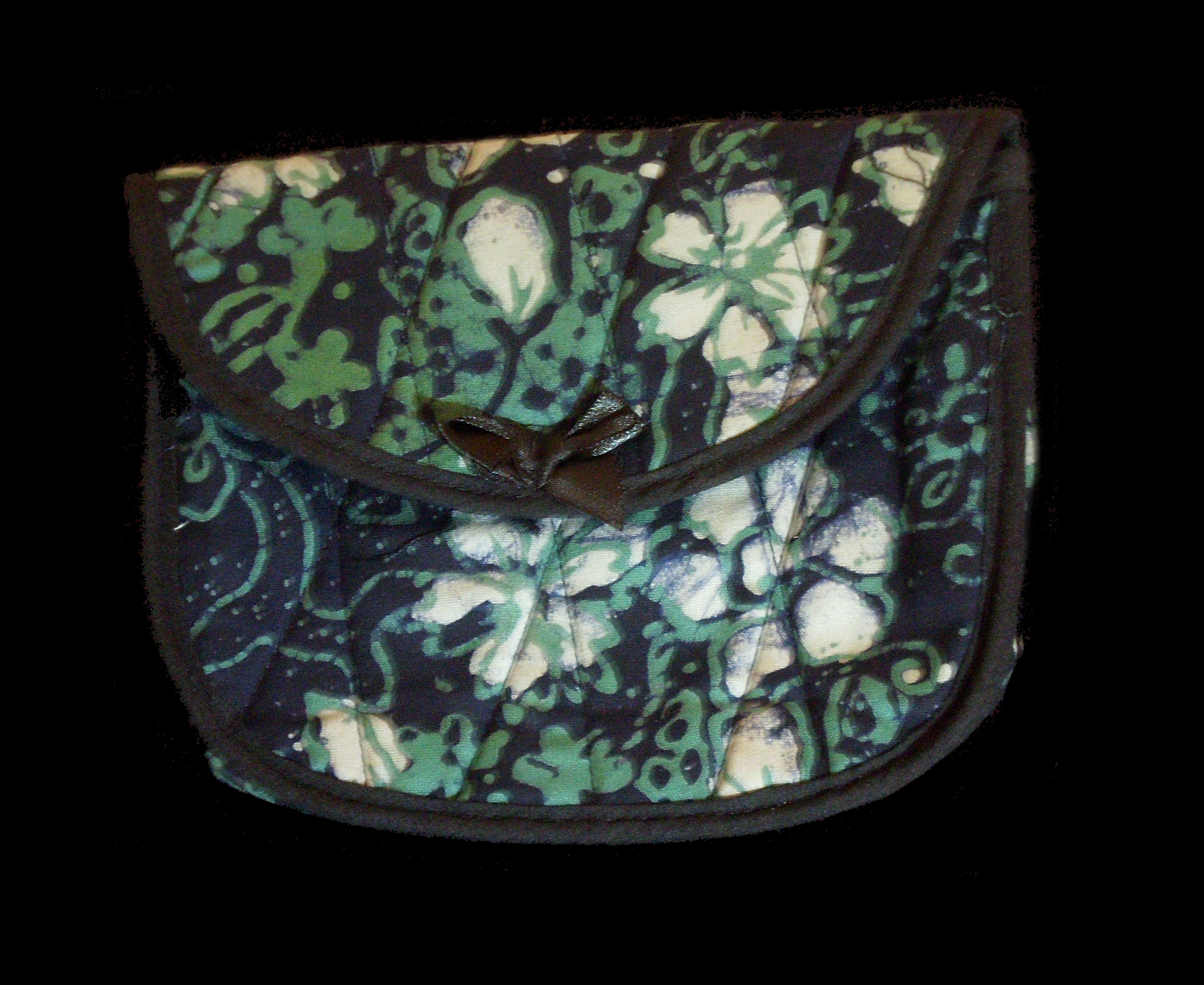 uniquely charming cosmetics purse, of hand-printed dark blue batik with