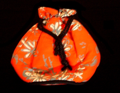 A unique string pouch, in hand-printed batik with bright orange floral motifs.