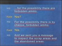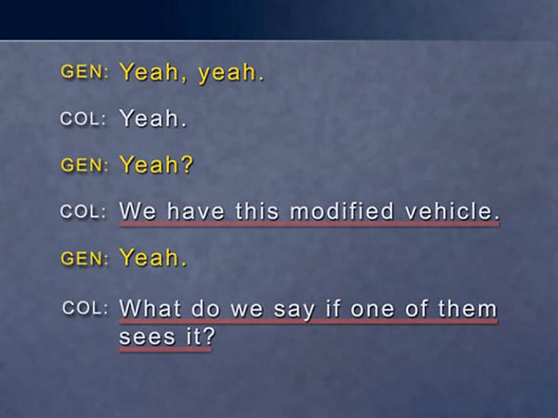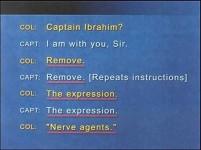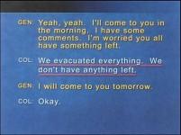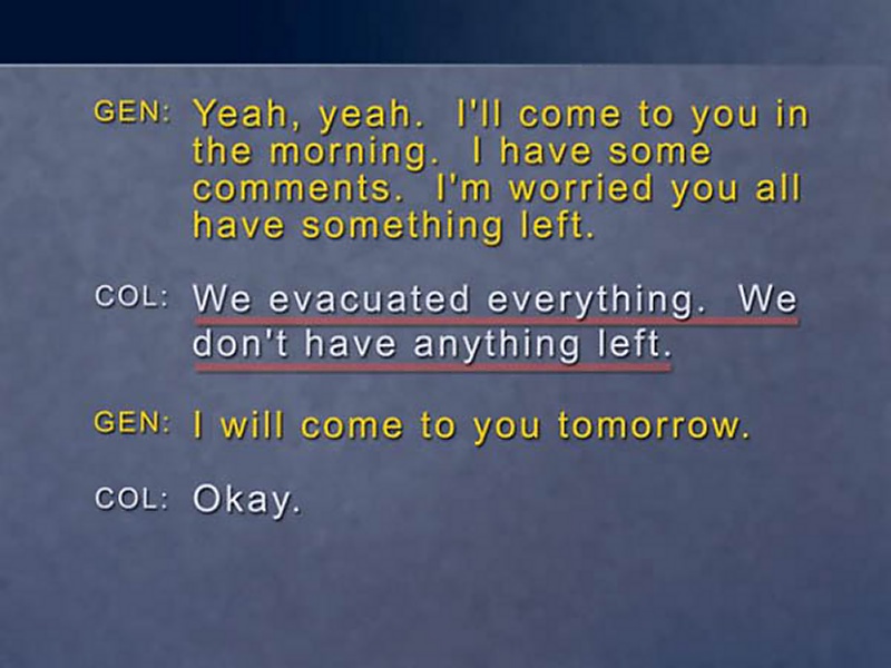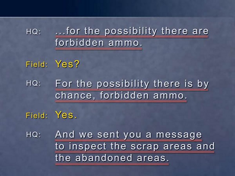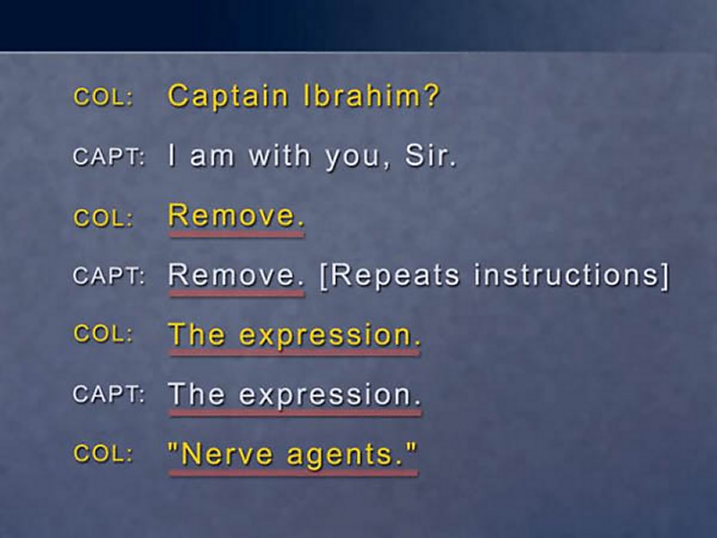 Let's review a few selected items of this conversation. Two officers talking to each other on the radio want to make sure that nothing is misunderstood. "Remove, remove." "The expression, the expression, I got it." "Nerve agents, nerve agents." "Wherever it comes up." "Got it." "Wherever it comes up." "In the wireless instructions." "In the instructions." "Correction. No, in the wireless instructions" "Wireless, I got it."