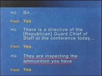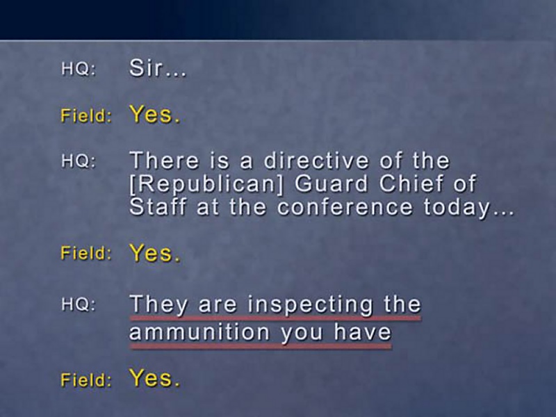 Just a few weeks ago we intercepted communications between two commanders in Iraq's Second Republican Guard Corps. One commander is going to be giving an instruction to the other. You will hear as this unfolds that what he wants to communicate to the other guy, he wants to make sure the other guy hears clearly to the point of repeating it so that it gets written down and completely understood. Listen.