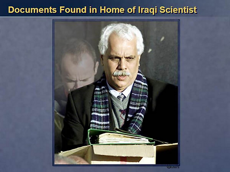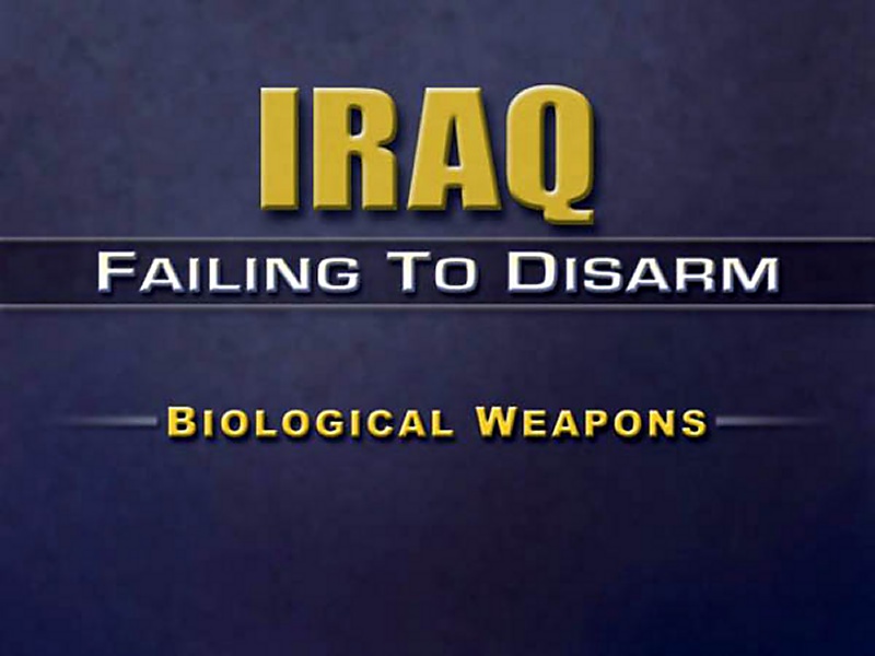 First, biological weapons. We have talked frequently here about biological weapons. By way of introduction in history, I think there are just three quick points I need to make. First, you will recall that it took UNSCOM four long and frustrating years to pry, to pry an admission out of Iraq that it had biological weapons. Second, when Iraq finally admitted having these weapons in 1995, the quantities were vast. Less than a teaspoon of dry anthrax, a little bit -- about this amount. This is just about the amount of a teaspoon. Less than a teaspoon full of dry anthrax in an envelope shut down the United States Senate in the fall of 2001.