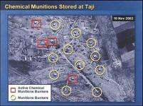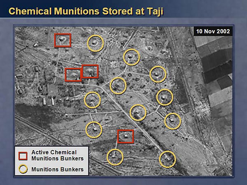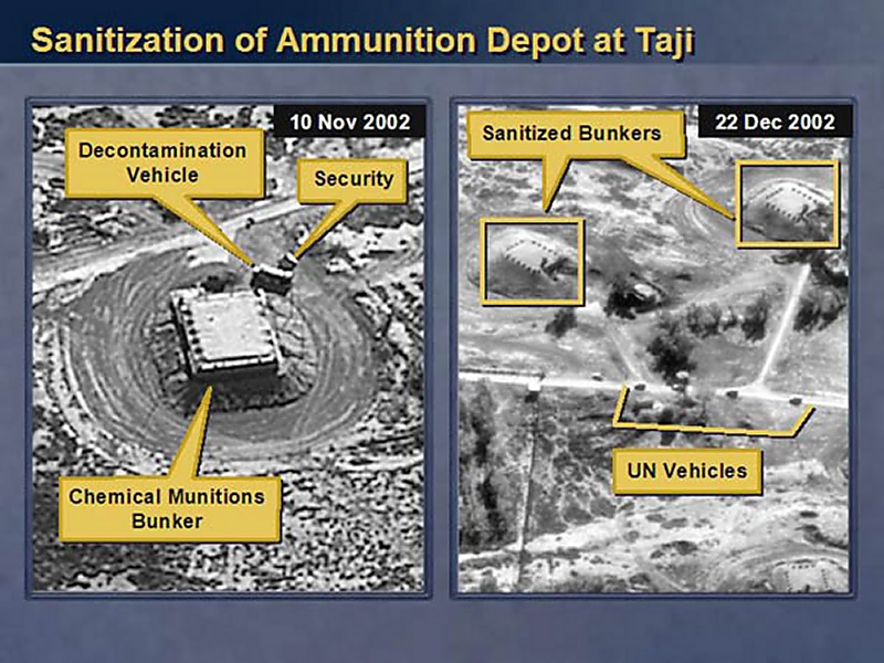Let's look at one. This one is about a weapons munition facility, a facility that holds ammunition at a place called Taji. This is one of about 65 such facilities in Iraq. We know that this one has housed chemical munitions. In fact, this is where the Iraqis recently came up with the additional four chemical weapons shells. How do I know that? How can I say that? Let me give you a closer look. Look at the image on the left. On the left is a close-up of one of the four chemical bunkers. The two arrows indicate the presence of sure signs that the bunkers are storing chemical munitions. The arrow at the top that says "security" points to a facility that is a signature item for this kind of bunker. Inside that facility are special guards and special equipment to monitor any leakage that might come out of the bunker. The truck you also see is a signature item. It's a decontamination vehicle in case something goes wrong. This is characteristic of those four bunkers. The special security facility and the decontamination vehicle will be in the area, if not at any one of them or one of the other, it is moving around those four and it moves as needed to move as people are working in the different bunkers.