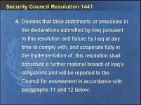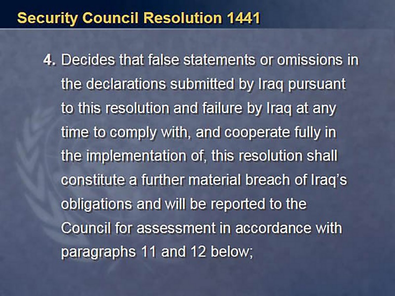 My colleagues, operative paragraph four of UN Resolution 1441, which we lingered over so long last fall, clearly states that false statements and omissions in the declaration and a failure by Iraq at any time to comply with and cooperate fully in the implementation of this resolution shall constitute -- the facts speak for themselves -- shall constitute a further material breach of its obligation.