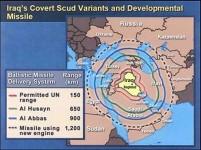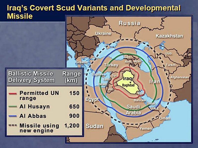 What I want you to know today is that Iraq has programs that are intended to produce ballistic missiles that fly over 1,000 kilometers. One program is pursuing a liquid fuel missile that would be able to fly more than 1,200 kilometers. And you can see from this map, as well as I can, who will be in danger of these missiles.