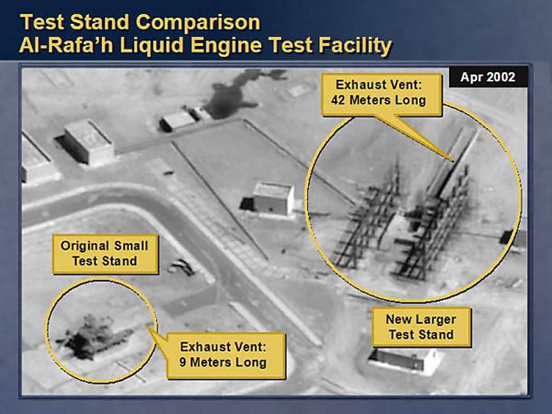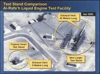 As part of this effort, another little piece of evidence, Iraq has built an engine test stand that is larger than anything it has ever had. Notice the dramatic difference in size between the test stand on the left, the old one, and the new one on the right. Note the large exhaust vent. This is where the flame from the engine comes out. The exhaust vent on the right test stand is five times longer than the one on the left. The one of the left is used for short-range missiles. The one on the right is clearly intended for long-range missiles that can fly 1,200 kilometers.