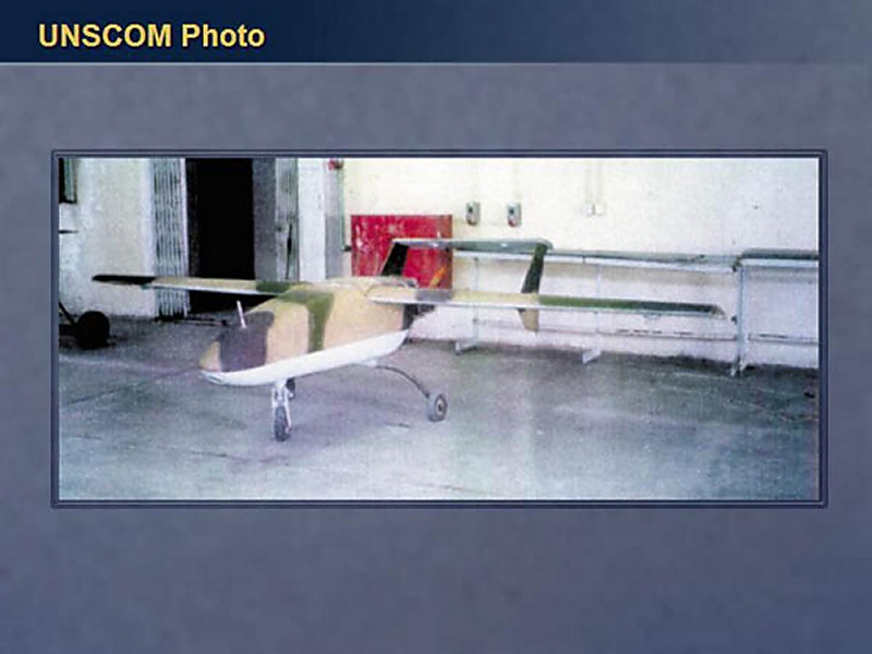 Now, unmanned aerial vehicles, UAVs. Iraq has been working on a variety of UAVs for more than a decade. This is just illustrative of what a UAV would look like. This effort has included attempts to modify for unmanned flight the MIG-21 and, with greater success, an aircraft called the L-29.