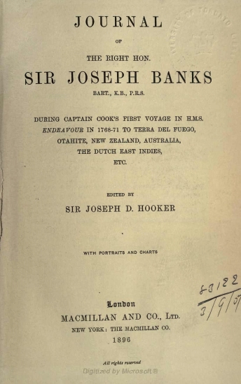 Journal of the Right Hon. Sir Joseph Banks during Captain Cook's first voyage in H.M.S. Endeavour in 1768-71 to Terra del Fuego, Otahite, New Zealand, Australia, the Dutch East Indies, etc.