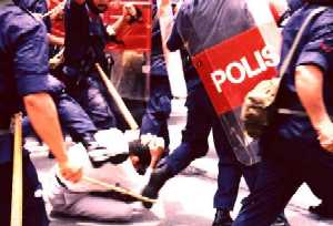 the demonstration by some 500 FRU riot police was violently broken up by