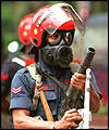a small crowd with fully loaded tear gas guns and batons swinging, people