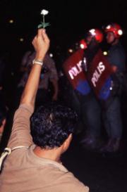 There were about 100 - 150 men, women and children - of all races (unlike the predominantly Malay crowds of last week). No loud shouting or slogans - I didn't hear the word "reformasi" uttered once, except in hushed tones. But there was a lot of laughter, embracing of friends and children playing with candles. Dozens of police and FRU troops were scattered around the area - and they made their presence felt. Frequently, they marched in single file through the crowd, looking at every person from head to toe as they passed by. One of the troopers stopped and asked me what I was doing here holding a lantern. "You're wearing Malay dress, you must be a Malay. What are you doing here? This is a Chinese festival. Why don't you just go home?!" he growled. "We're a multi-racial nation," I replied. "We celebrate our festivals together, we mourn our sorrows and share our fears together". He then glared at the white ribbon I was wearing on my shirt - the reform movement's symbol of justice. For a while, I was half-expecting another interrogation about what that meant.
