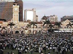 They had apparently been told to move from Independence Square, so the crowd proceeded to the National Mosque and gathered in the compound facing the Islamic Centre. To their credit, the police kept a low profile, and the crowds behaved peacefully. It was a mixed bag of people - families, students, yuppies - of all races, though the majority was Malay. It was heart-warming to see this 60-year old Chinese pensioner standing next to me punching his fist into the air and shouting "Reformasi!". Who says it is only the young who want change?